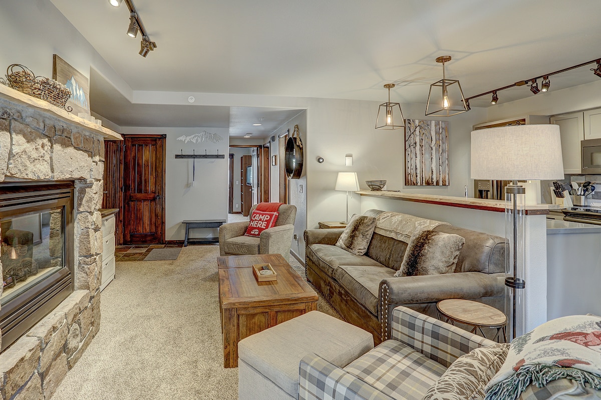 POR FAVOR, TEN EN CUENTA QUE: El complejo de piscinas estará cerrado del 27 de abril a mediados de mayo de 2026 No está disponible el registro anticipado ni la salida después de la hora establecida. Relájate en este espacio tranquilo y elegante. Nuestro cálido y acogedor condominio está ubicado en una zona tranquila pero conveniente muy cerca de los ascensores y la ciudad. Acurrúcate hasta la chimenea de gas, relájate en la terraza cubierta y las sillas Adirondak con café o un coctel. Utiliza las batas proporcionadas para dar un paseo fácil hasta la piscina y las bañeras de hidromasaje después de un día de esquí o senderismo. El lujo de montaña se encuentra a solo un clic de distancia.