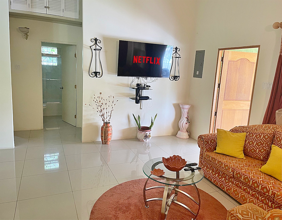 THE RUBY is a serene ECO SMART villa nestled in a gated community in the hills, 15 minutes from Ocho Rios and is ideal for families & remote workers. The villa features modern conveniences including 24/7 security, solar power + battery, A/C, ceiling fans, Wi-Fi, 2 water tanks, fenced gated back yard, security cameras, workstation with monitors, 4 smart TVs, water filtration, extended patio with a lit pergola, BBQ, basketball arcade & board games. Extras: car seat, crib, baby bath and highchair.