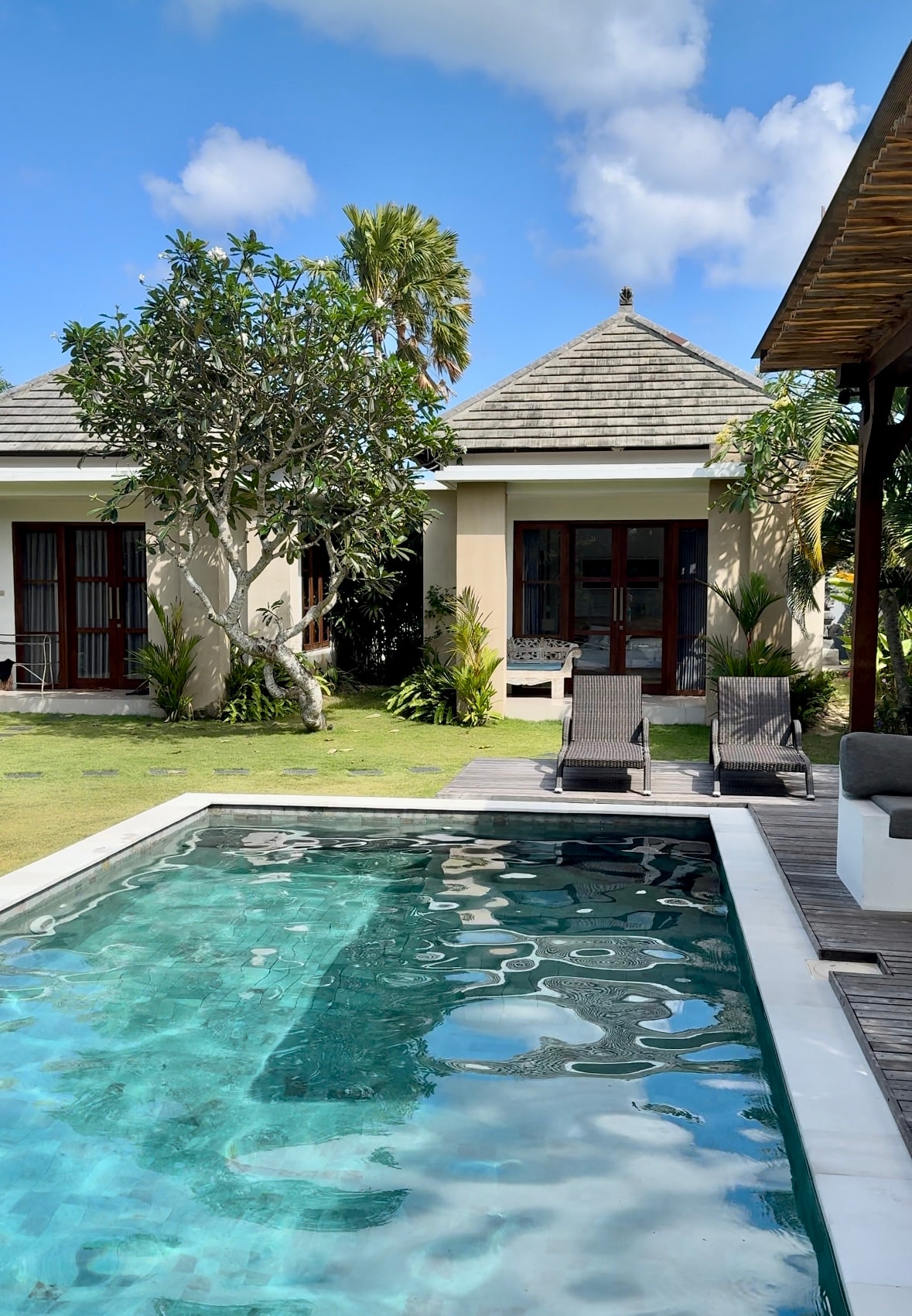 = SAFE AND DRY AREA = Our cozy little bungalow is all about - you being our preferred guests - quality (everything is new and works) - super WiFi internet with fiber optics connection and private router - crystal-clear 15 m long lap pool - close to the beach - total privacy - open-air shower - open well-equipped kitchen - car garage and motorbike parking is safe and secure within the main gate, shared with us. - The total privacy of your villa starts after you cross the safe parking area.