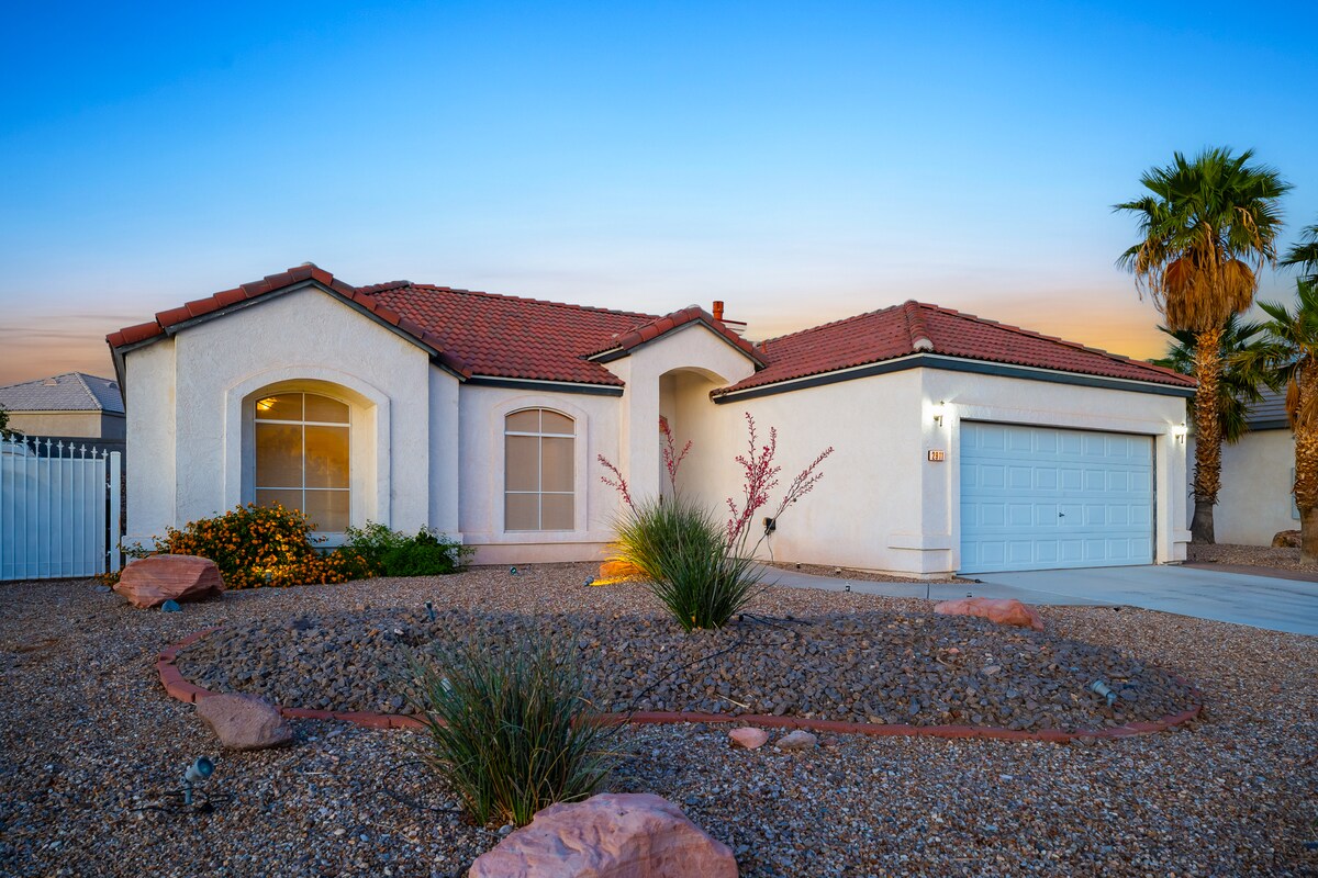 Relájate con toda la familia en este tranquilo alojamiento en el corazón de Bullhead City, Arizona. Ubicada cerca del río Colorado, de parques familiares y de Laughlin Casinos & Resorts, esta casa ofrece relajación y entretenimiento. Disfruta de una sala de juegos exclusiva para divertirte después de un día de excursión. Este espacio agrega una capa adicional de entretenimiento, lo que hace que el alojamiento sea ideal tanto para escapadas cortas como para estadías más largas. A solo 1,6 millas (5 minutos) de Rotary Park (acceso al río) y a 7,2 millas (15 minutos) de Laughlin Casinos.