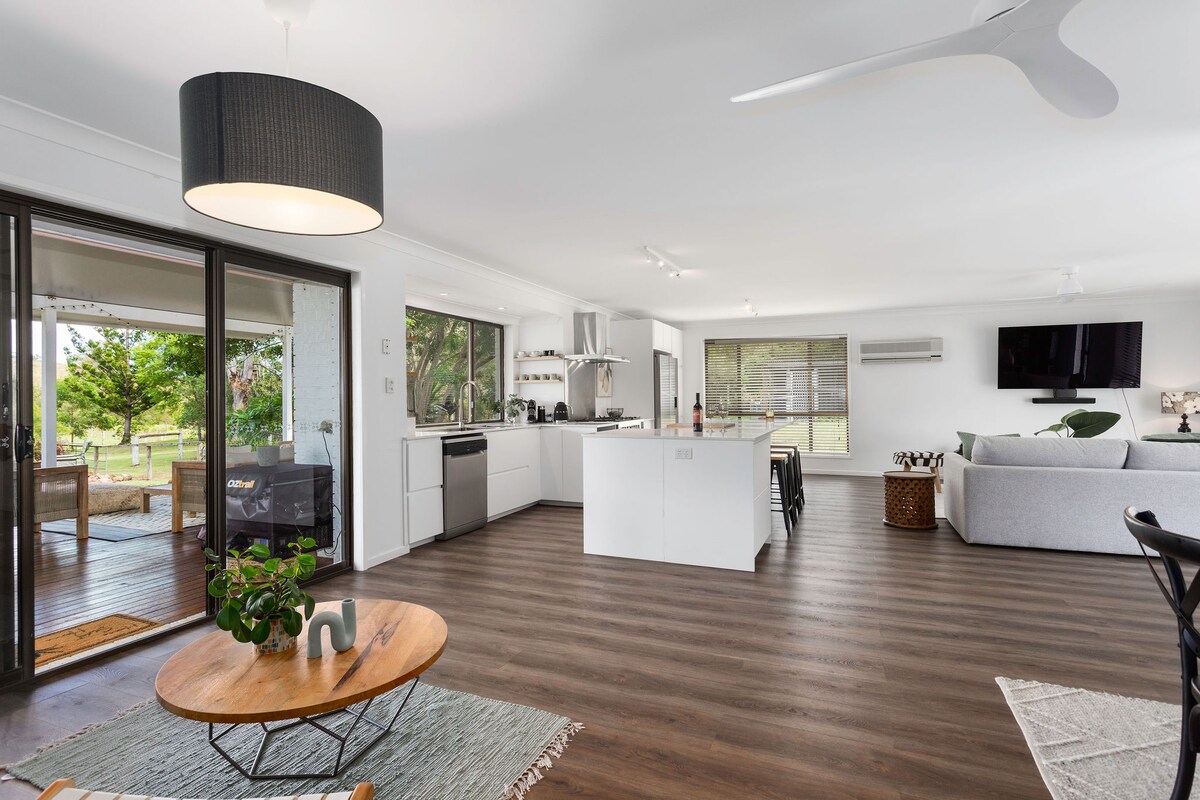 Una escapada perfecta al campo, tu propia granja tranquila ubicada en 50 acres enclavada en una colina con impresionantes vistas de las montañas del Scenic Rim. A poco más de una hora de Brisbane, puedes relajarte en la terraza disfrutando de una copa de vino de una de las bodegas cercanas, sentarte alrededor de la chimenea o asar nubes de azúcar en la hoguera. La casa está a solo 7 minutos en coche del municipio de Boonah y en la misma carretera y a solo 3 minutos en coche de Kooroomba Vineyard & Lavender Farm.