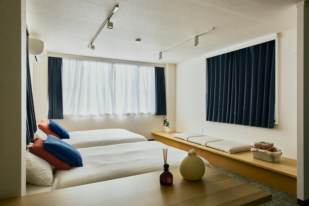 Recientemente construido pensando en los viajeros. Las habitaciones son espaciosas con camas tamaño queen (prácticamente inauditas en Japón). Smart TV, Wi-Fi, té y café. Los baños están de moda, con grandes duchas de lluvia. Espejos LED para prepararte para cualquier iluminación que te encuentres. Las habitaciones tienen una nevera bar, microondas y hervidor de agua para que pueda almacenar y preparar comidas y bebidas listas para usar. Todas las habitaciones están equipadas con aire acondicionado, ventiladores de techo y cortinas opacas. ¡Amplio espacio de almacenamiento también!