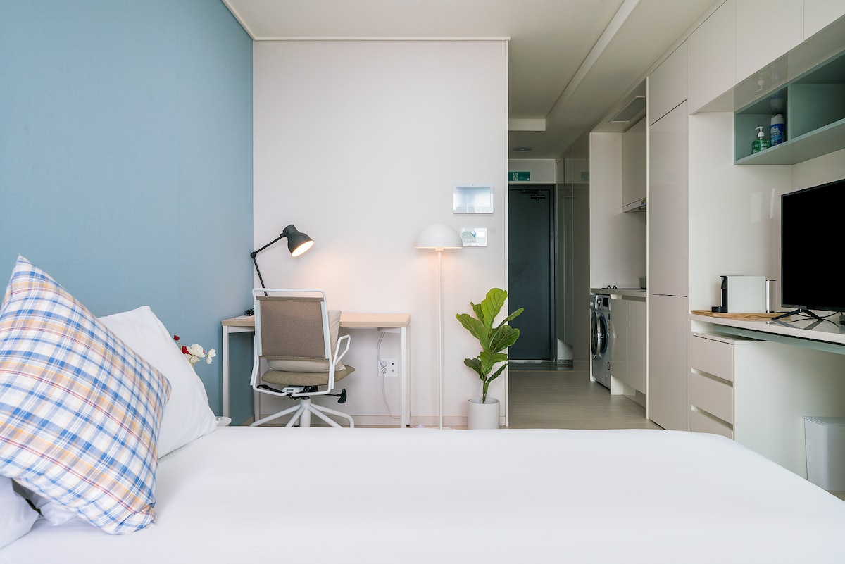 il Porto⚓️ Bringing back host's experience as a fashion designer in Italy, old port-themed wall deco & nautical pillows Main colors _Ivory/Gray+Wood/Navy Mood_Neat, timeless 🕯️Custom Lighting *Dual LED bar *High-rise wall frame (7m-long multicolor LED) 🛌 *King bed 📺 4K Chromecast TV 🍿 FREE Netflix 💧FREE water, ‘LG PuriCare’ * E-Mart (2F., largest Daiso store) 180m ⚠️Pets not allowed / Gym & Swim not in service (under Prep.)
