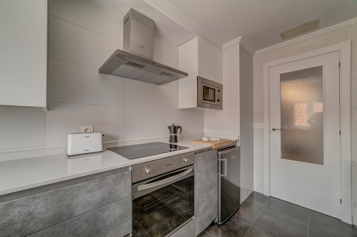 Apartamento NUEVO con ascensor en pleno centro, con mobiliario de diseño y calidad. El apartamento está compuesto por DOS dormitorios (camas de 150 cm), SALÓN COMEDOR con sofá cama (colchón visco elástico de 160 cm), BAÑO con ducha y COCINA independiente equipada con todos los electrodomésticos y menaje que se pueda necesitar. Posibilidad de acceso a Parking (19,90 €/día) y Gimnasio (Existen descuentos en Parking y gimnasio para estancias superiores a 1 semana).