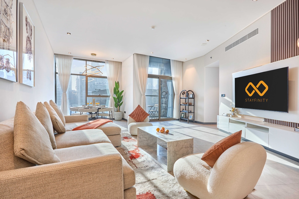 Experience luxury in our 3-bedroom Downtown Dubai home with direct Burj Khalifa & Fountain views. This bright, spacious retreat in Burj Vista comfortably fits 8 guests. Enjoy a tranquil stay with sophisticated design, steps from the Dubai Mall. Seamless indoor access to the mall and Dubai Metro makes exploring the city effortless. Perfect for families or groups seeking comfort and convenience in the heart of the city.