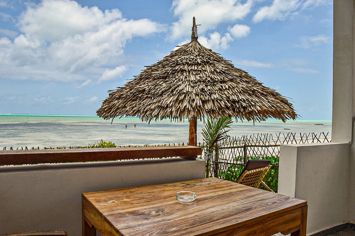 Estudio privado situado en el primer piso de un bungalow de playa, directamente en la playa de arena blanca de Jambiani. Cuenta con una gran terraza con vistas al océano Índico, entrada privada y un patio de arena lateral (como una playa) con sofá al aire libre y tumbona, sombreado por una sombrilla tradicional suajili. Wifi ilimitado.