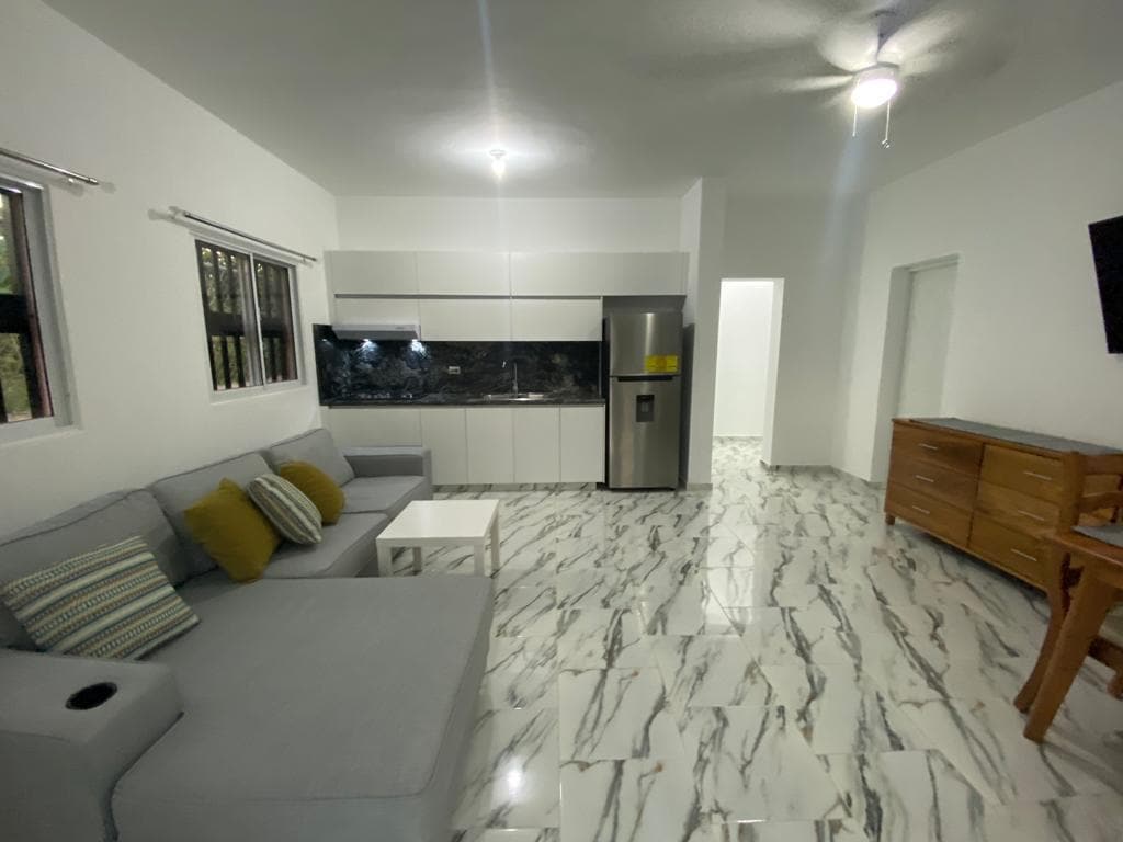 Ubicado en una urbanización súper tranquilo, fresco y moderno ubicado en la parte este de Cabarete. Solo 7 minutos del centro, y 10 minutos caminando a la playa más cercana. 1 habitación grande, cocina completa y sala de estar espaciosa.