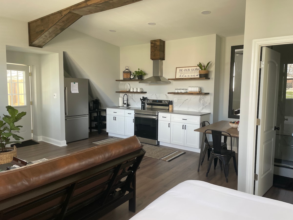 Este alojamiento con estilo es perfecto para una pareja. Estilo divertido porque, ¿quién no siente alegría al despertarse con colores brillantes? Este espacio se encuentra en el segundo piso y tiene una cocina bien surtida y espaciosa para cocinar. Cabezal de ducha tipo cascada en la combinación de baño/ducha para una relajación increíble. Cómodo colchón tamaño queen de 12 pulgadas con TV en el dormitorio. Todo rodeado por la elegante sala de estar con un sofá futón, diván, TV inteligente grande y una chimenea eléctrica. Un pozo de fuego compartido en la parte trasera e internet de alta velocidad.