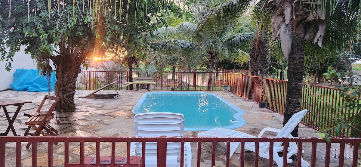 Casa construida para minha área de lazer, mas será compartilhada com voce que quer um cantinho tranquilo, isolado da agitacao da cidade. Ideal pra quem esta de férias, ou em viagem, sentido Cba Rondonia ou vice versa, visto que estamos localizados em um bairro na entrada da cidade, proxima ao trevo (BR 070). (Rua nao pavimentada) Tbm é uma opção aqueles que estão mudando pra Cáceres e ainda não conseguiram alugar ou comprar sua casa; aqueles que querem conhecer o Pantanal; Filhos na Facul, etc
