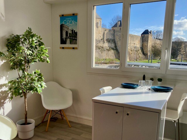 🏰 Appartement rénové de 80 m² avec vue imprenable sur le Château de Caen et parking privé et sécurisé. 🌼 Il dispose de deux chambres, d'une cuisine équipée, d'un salon avec coin repas, d'une salle de bain avec douche et d'un balcon/terrasse privée. 🛜 Wi-Fi et TV inclus. ✨Situé dans le quartier emblématique du Vaugueux, en face du Château, près des ruelles pavées, maisons médiévales, restaurants et bars — un cadre historique unique et plein de charme qui saura vous séduire !