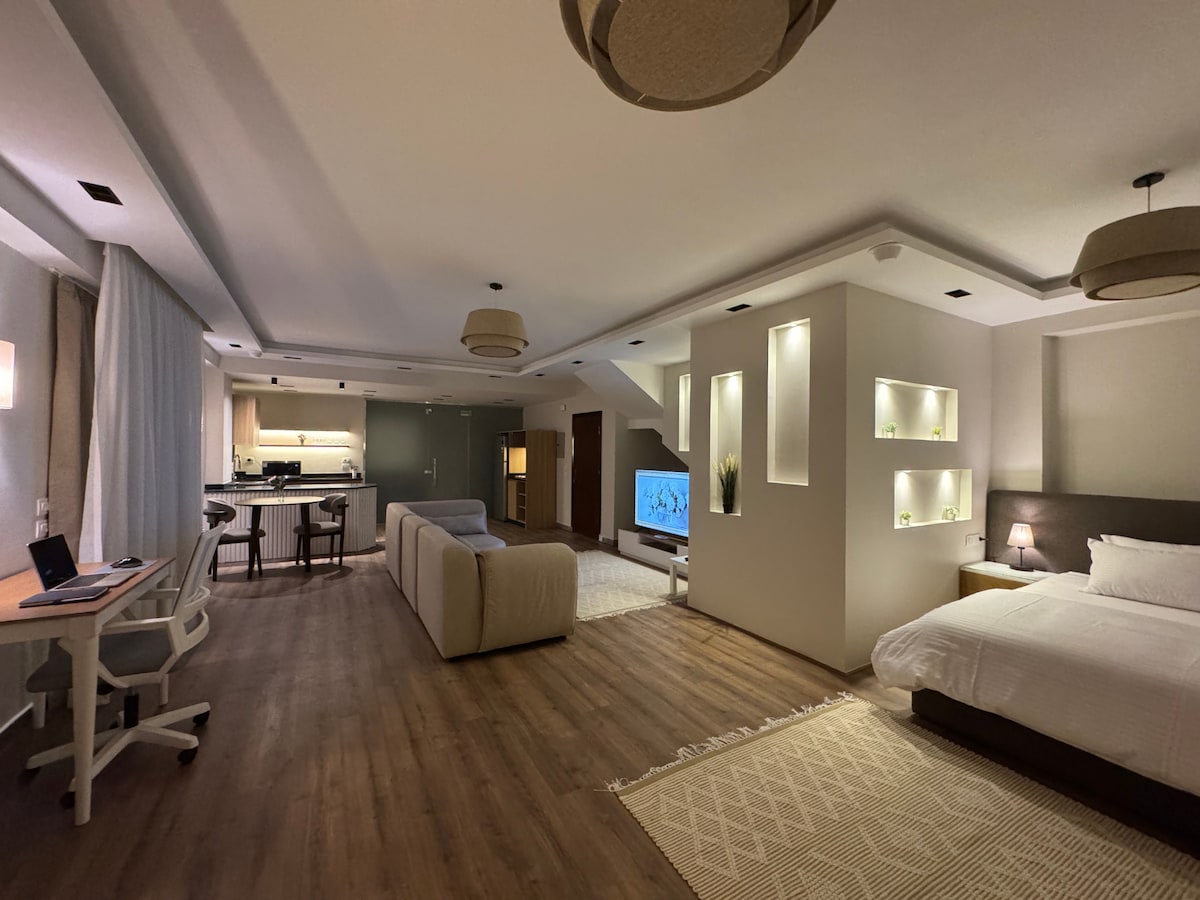 استوديو فاخر بتصميم مودرن وأجواء هادئة، ideal para parejas y viajeros solos. Disfruta de un estudio de lujo con bañera independiente, iluminación moderna y cálidos acabados de madera para una estancia relajante. 📍 Ubicación privilegiada cerca del centro comercial City Stars, Nasr City TV ✔️ inteligente ✔️ Wifi rápida ✔️ Aire acondicionado ✔️ Cocina pequeña totalmente equipada ✔️ Espacio de trabajo para el trabajo remoto ✔️ Planta baja: acceso fácil Perfecto para estancias románticas, viajes de negocios o escapadas urbanas cortas. Limpio, elegante y privado.