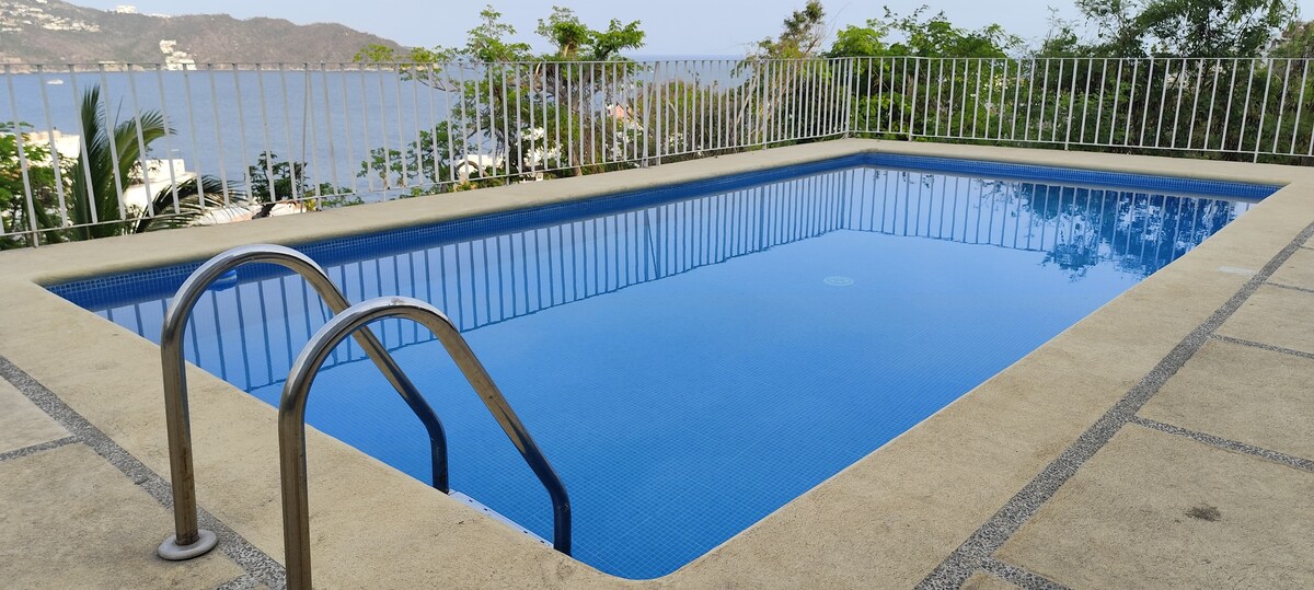 Acogedor departamento, con una vista excelente de la Bahía de Acapulco. Privacidad y sin el ruido para tener unas vacaciones agradables. Dos recamaras, dos baños completos, cocina equipada, aire acondicionado y ventiladores de techo para refrescar todo el departamento. La alberca a unos cuantos pasos de ti, disfruta de la vista. El depto. está recién remodelado por lo que en su mayoría todo es nuevo listo para que lo uses. Con excelente ubicación para ir a disfrutar de las playas.