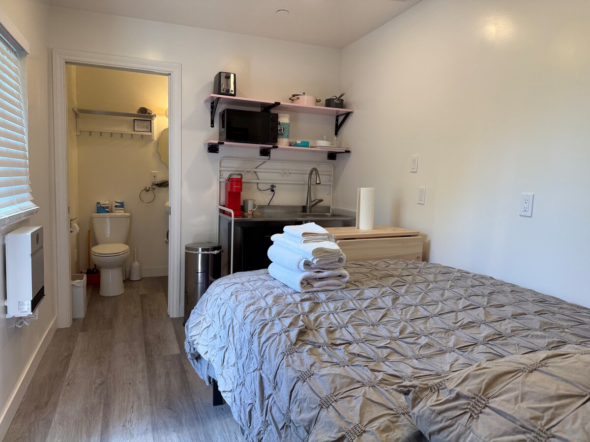 ¡Disfruta de este encantador estudio soleado para 2 personas con una ubicación conveniente! Nuestro estudio de nueva construcción está cuidadosamente diseñado y cuenta con una cocina totalmente equipada con cafetera Keurig, 1 cama de espuma viscoelástica de tamaño completo, sala de estar, lavadora/secadora en la unidad, aire acondicionado, wifi, Netflix. ¡Estamos totalmente amueblados con todo lo que necesitas! Relájate en nuestra chimenea al aire libre después de un largo día o haz algo de ejercicio con nuestra mesa de ping pong. ¡Estamos a pocos minutos en coche de restaurantes, tiendas, tiendas de comestibles y parques!