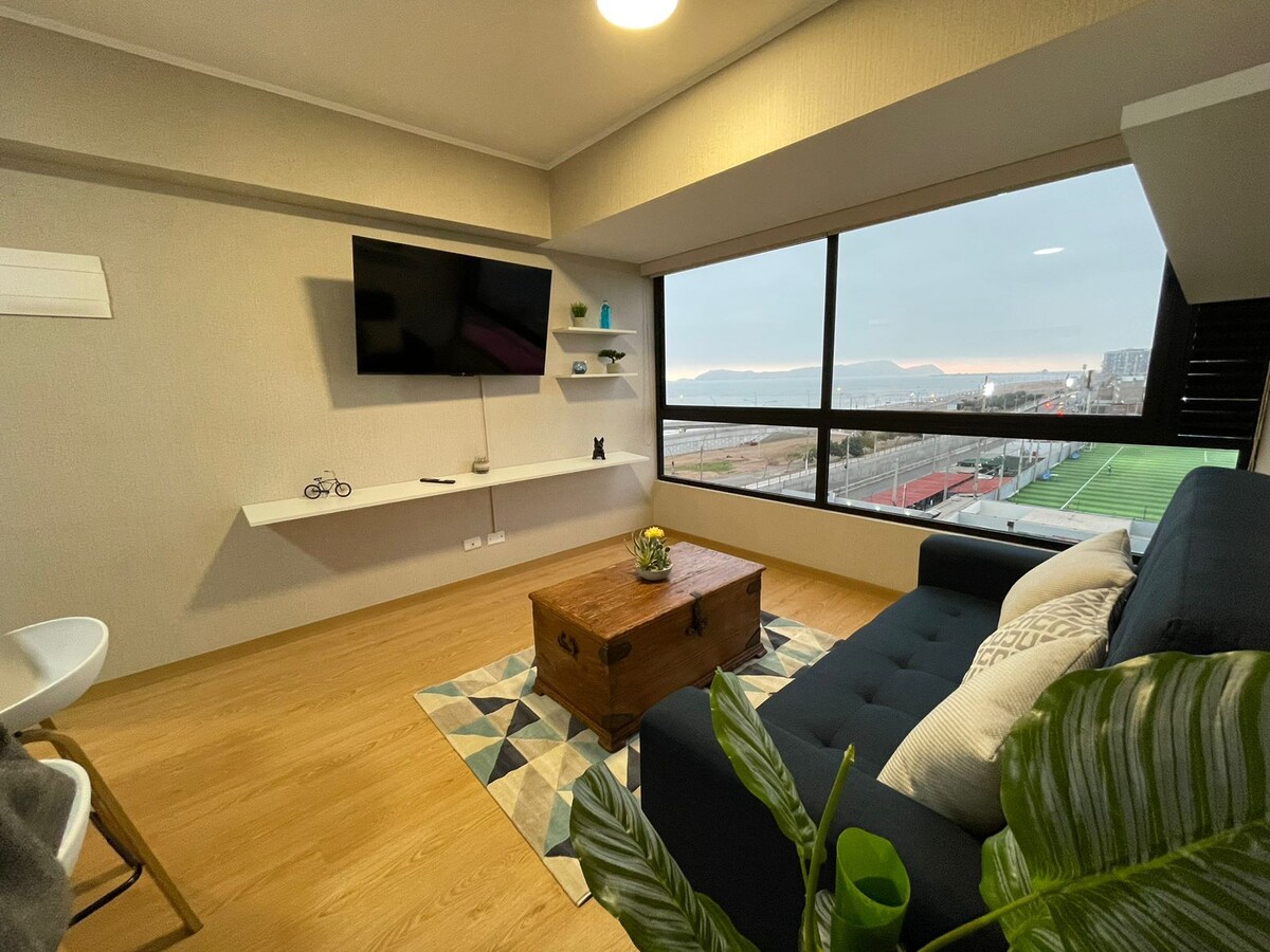 Departamento con hermosa vista al mar, cerca al Aeropuerto y de los mejores lugares turísticos de Lima, amoblado con todas las comodidades. Consta de: Sala, escritorio, Kitchenette, 1 Dormitorio con cama queen, 1 baño y una Terraza con vista al mar. Con áreas sociales: Sala de Cine, Sala de juegos, Patio con Fogón, Lavandería, Sala de Adultos, Gimnasio, Sauna, Ambientes de Parrillas, Terraza con Tina de hidromasajes, Piscina para adultos y niños.