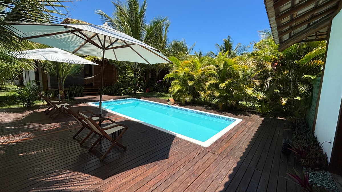 Divirta-se com toda a família neste lugar cheio de estilo. Linda casa com ampla varanda e redes. Cozinha americana, sala de estar com TV a cabo, sala de jantar, 3 quartos sendo 2 suítes e dependências. Jardins e garagem coberta p/ 2 carros. 750 mt de terreno com árvores. Wi-fi em toda a casa. Quartos com ar condicionado, camas queen e mosquiteiros. A 100 m da linda praia dos três coqueiros e 800 m da Ponta do Mutá onde podemos assistir o pôr do sol mais lindo da Baía de Camamu.