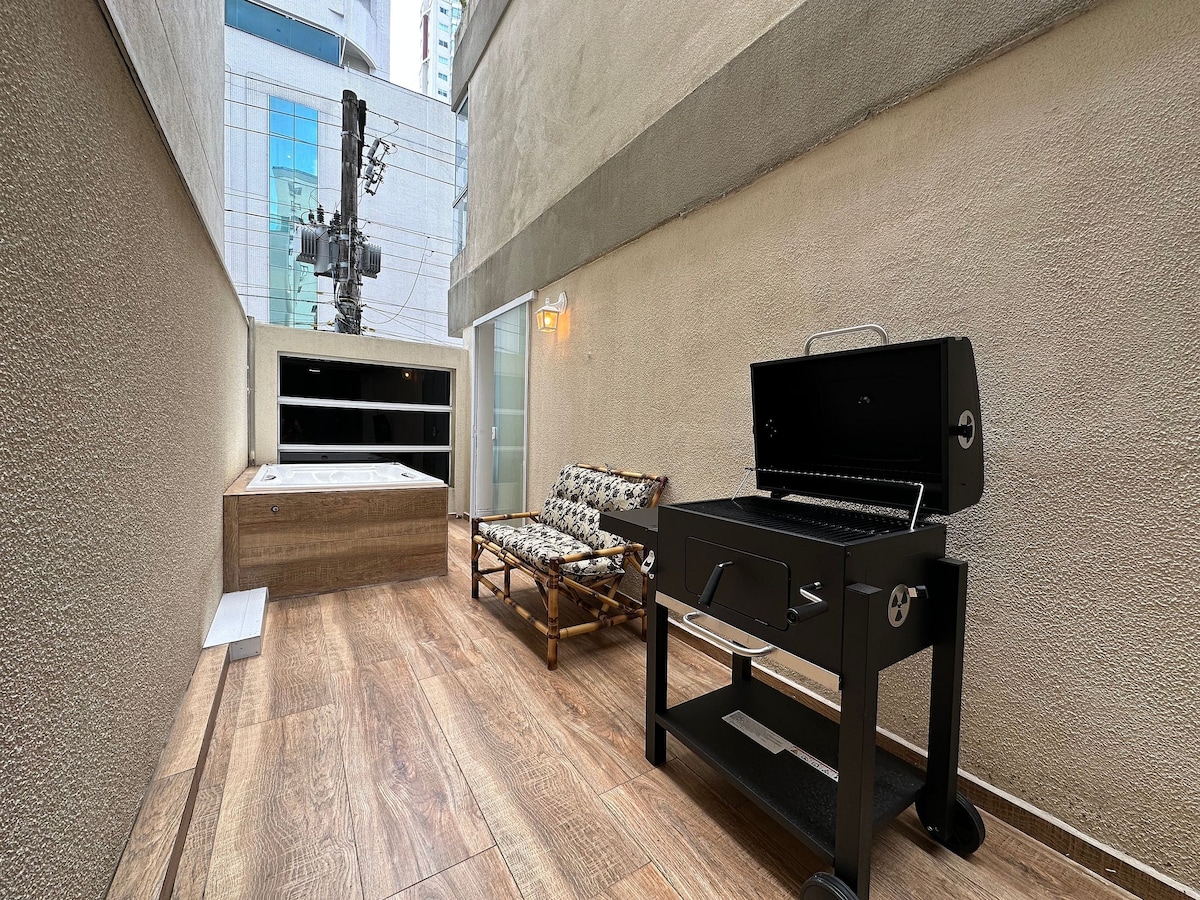 Lounge Apartment, located 5 minutes from Brava Beach and 10 minutes from Balneário Camboriú. The location is perfect. Only 5 blocks from Beach. Close all parties and restaurants. Condo with complete infra, Pool, Gym, Steam and 5 Barbecues. The apartment has Mountain-facing Jacuzzi with hydro and chromotherapy. Ideal for relaxing or take a romantic time. It has 58 'smart TV in the living room and 40' in the bedroom. Full kitchen. Machine washes and dries. You will love this place.