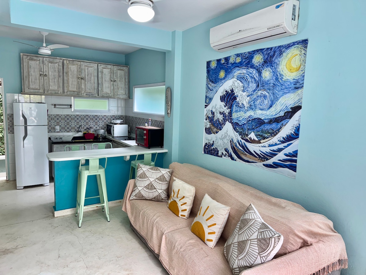 Hay 02 bungalows en el mismo edificio, ubicados en el apreciado Canto de Camburi, un lugar tranquilo y a 150 metros de la playa. Alojamiento perfecto para parejas y también para familias con un niño. ¡Los perros dóciles y que no ladran son bienvenidos! En el mismo lugar, se encuentran las casas de los anfitriones, Denise y su hermano Elsom, y también la mascota anfitriona: Kiwi. Hay dos unidades, ambas cuentan con cocina equipada, TV, aire acondicionado, ropa de cama y toallas, almohadas, wifi y una agradable terraza con jardín.