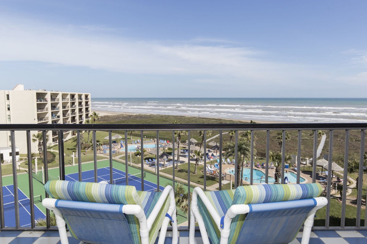 Spend your vacation in this beautiful corner Beach Front condo with spectacular views from the 4th floor overlooking the Gulf!! Recently remodeled with granite counters and fresh paint. Direct access to the beach, pool / hot tub. 1 bedroom plus bunk beds and queen sofa bed to accommodate up to 6 guests. Enjoy your mornings watching the sunrise. Fast WIFI and parking for our guests. BE ADVISED THE POOL WILL BE CLOSED UNTIL DECEMBER 26