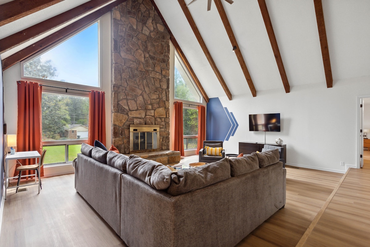 Mt Olive is the urban retreat you need. Getaway to this spacious, vintage-camp inspired, two bedroom cabin with a loft. Cozy up by the double-sided fireplace with a beverage of choice and your favorite people. Retreat for deep work as well. Our cabin features fast reliable wifi, a large working table, and a tucked away writing desk. Take in the wooded views from every room - you’ll forget you’re 10 minutes from the airport and 20 minutes from downtown.