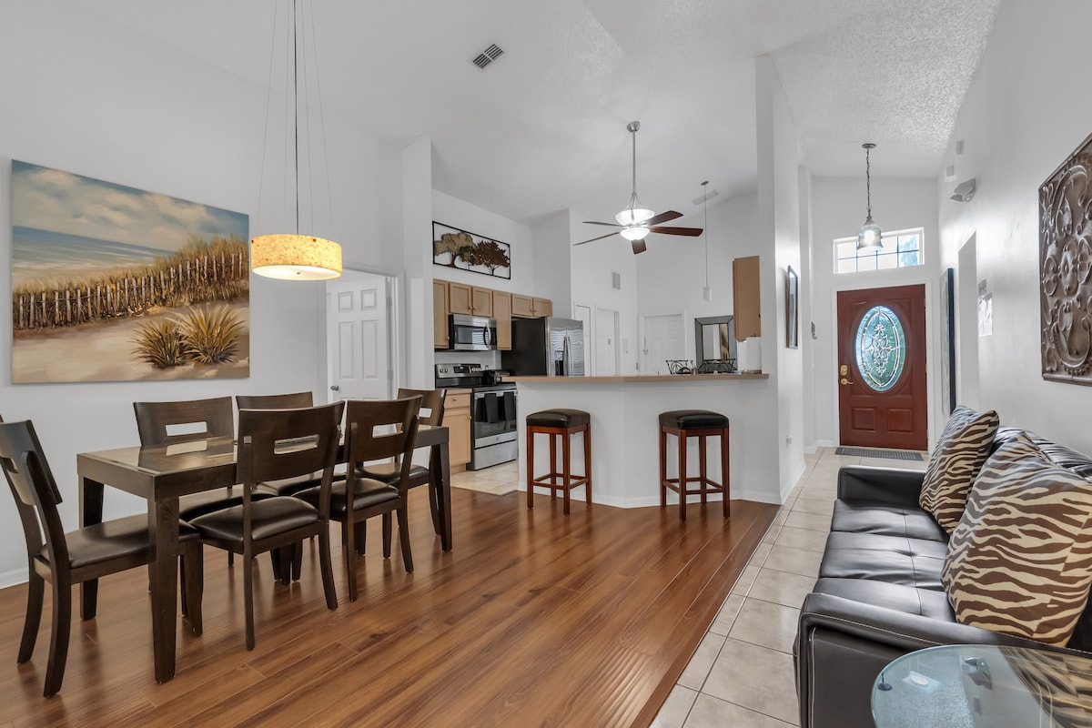 ¡Tu puerta de entrada a Disney! Amplia casa adosada de 3 dormitorios a solo 10 minutos de los parques. Relájate en la piscina compartida del centro vacacional o en tu jacuzzi privado, transmite películas con Wi-Fi rápido y cocina en la cocina totalmente surtida. Habitación principal tamaño king + 2 cómodas habitaciones para invitados Estacionamiento gratuito y lavandería en el alojamiento Comunidad cerrada con gimnasio y parque infantil ¡Reserva hoy y deja que comience la magia!