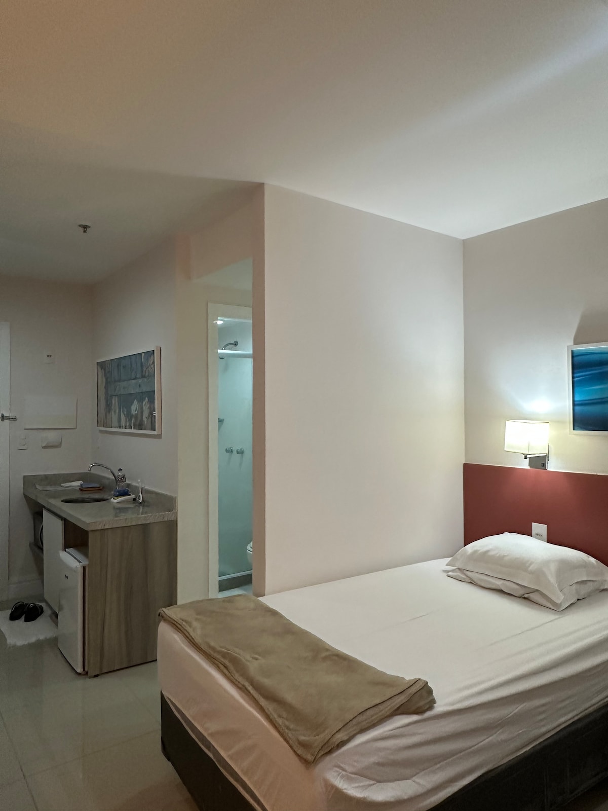 Ambiente acolhedor e confortável. Quarto amplo, cama de casal queen, cozinha com cooktop, frigobar e ar condicionado.
