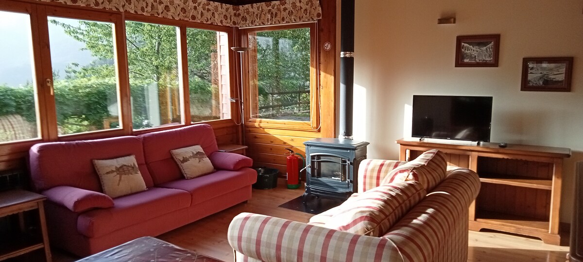 El apartamento (número de registro HUT 005665) es la planta baja del chalet, totalmente independiente, 190m2 con uso exclusivo del jardín. Tiene 3 habitaciones dobles con cuarto de baño y ducha, cada habitación tiene acceso al jardín o la terraza. La cocina está totalmente equipada, hay salón/comedor y una sala de ping pong/juegos. El precio incluye ropa de cama, toallas, wifi, calefacción y leña, y la limpieza final.