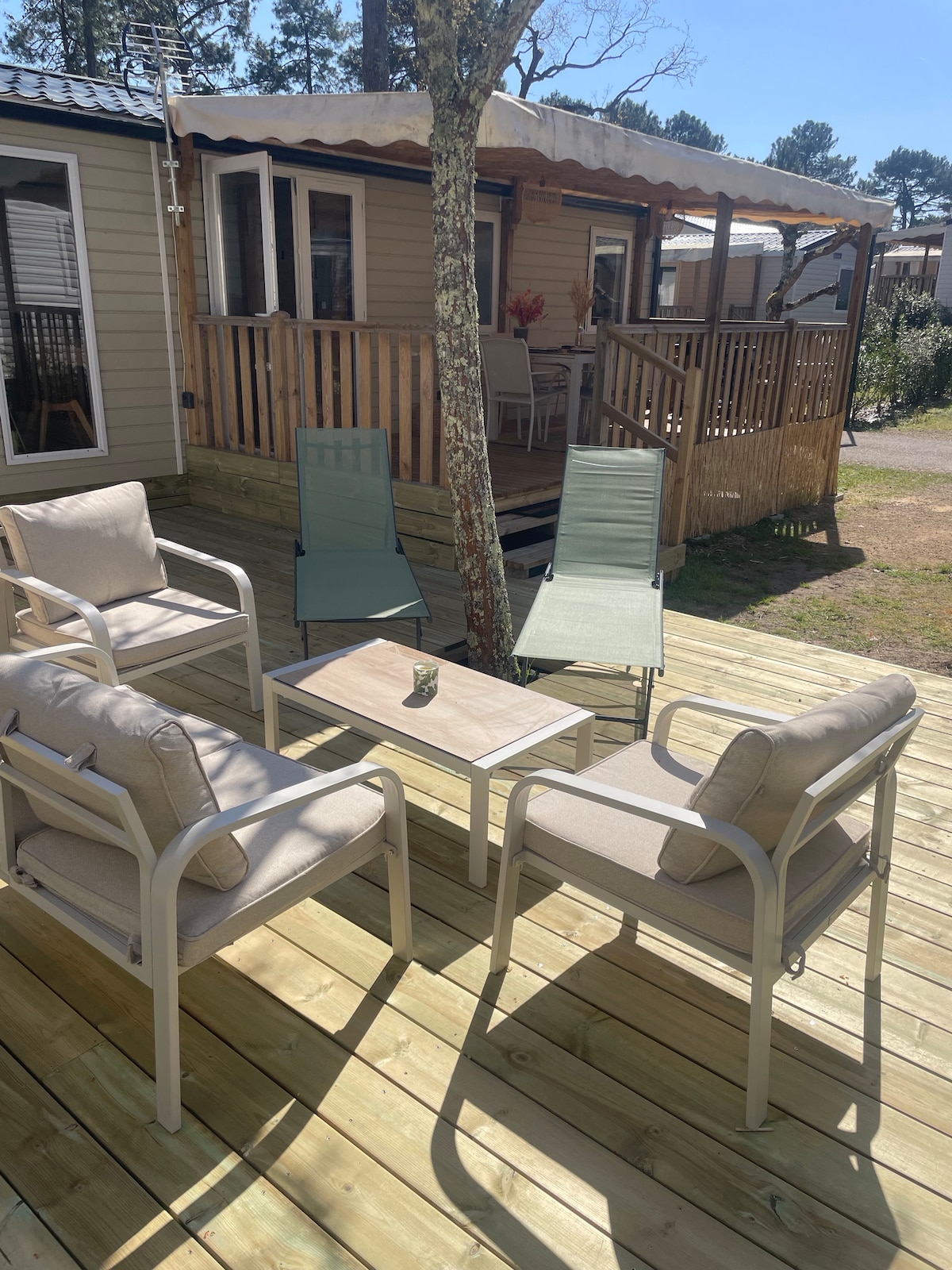 Mobilhome en camping de 4 estrellas en la península de Cap-Ferret. Habitación principal con 1 cama de matrimonio y vestidor contiguo, 2 habitaciones con 2 camas separadas. Cocina totalmente equipada con placas de gas, horno de gas, microondas, cafetera, incluida una Dolce Gusto, lavavajillas, nevera con congelador... 1 televisor grande en el salón y 1 lavadora disponible. Aire acondicionado. Amplia terraza cubierta, parcela con mesa, plancha, 2 tumbonas ...no se admiten perros (alergia)