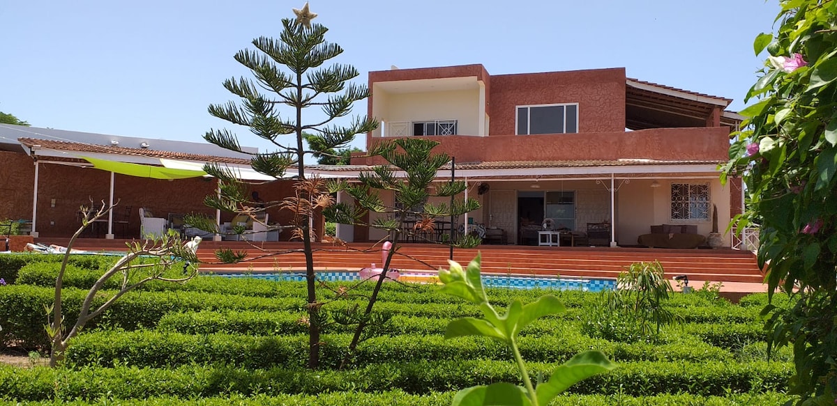 Détendez-vous dans cette belle villa de 800 mètre carrée dans une cité sécurisée . Séjournez dans une villa calme avec un dépaysement et une évasion assurée . Situé à seulement 3mn de la lagune de somone et de la plage Royal Baobab (Decameron),prenez une bouffée d'oxygène à seulement 1h de Dakar et profitez de moments mémorables en famille ou entre amis. Mobiliers et décoration faite avec beaucoup d'amour et de nombreuses pièces provenant de nos voyages. Vous vous sentirez chez vous !