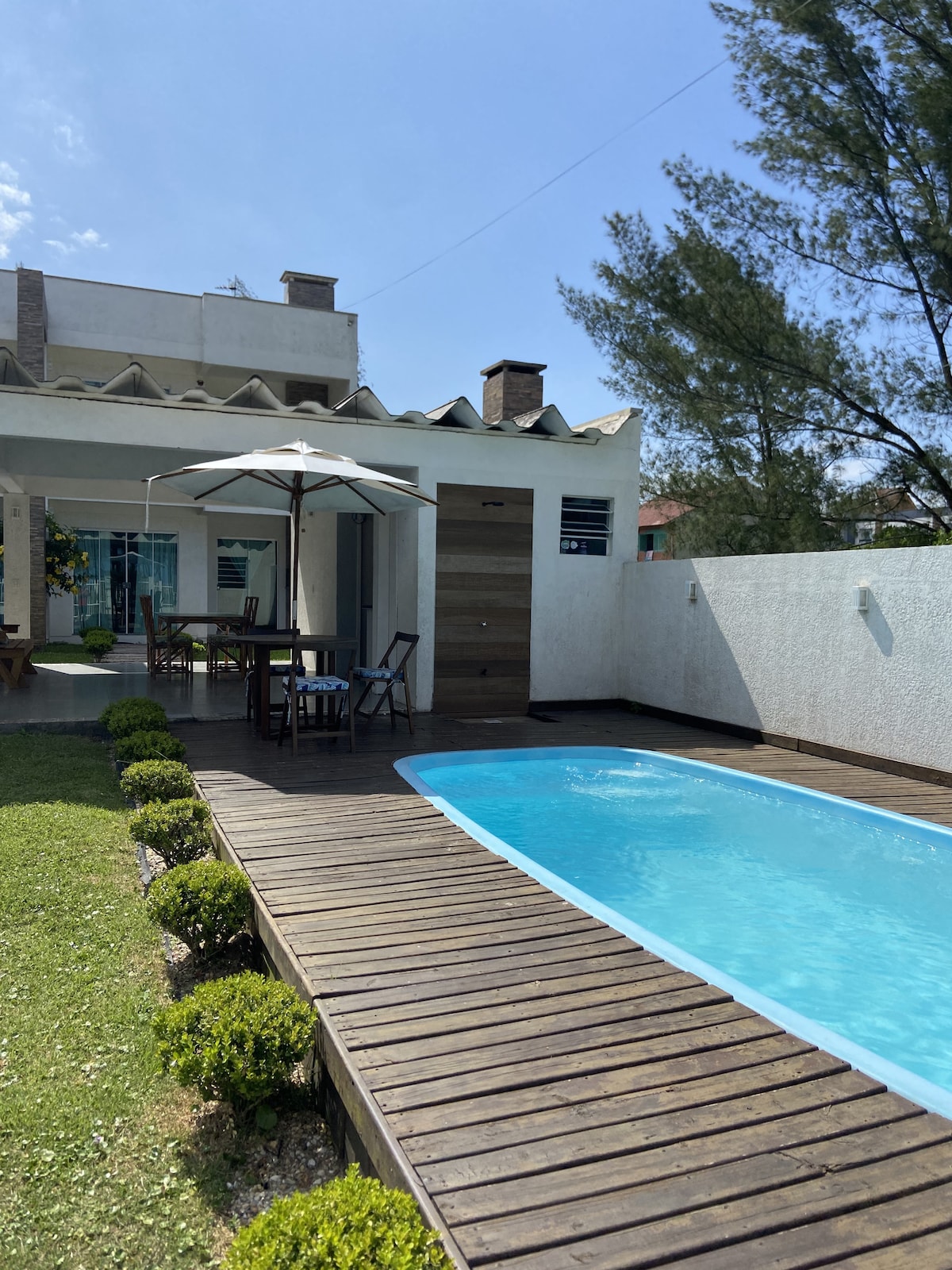 En primera línea de playa, con vistas. Casa en condominio con dos piscinas, para adultos y niños, sala de juegos. Patio interior cerrado, muy seguro para los niños. Casa completa y de alta gama. Estacionamiento, barbacoa, espacio de red. La zona frente a un mate mirando el movimiento del paseo marítimo. Ambiente en la parte trasera de la casa con pérgola y vista al patio y piscina del condominio. Televisión e Internet a tu disposición. Se admiten animales pequeños.
