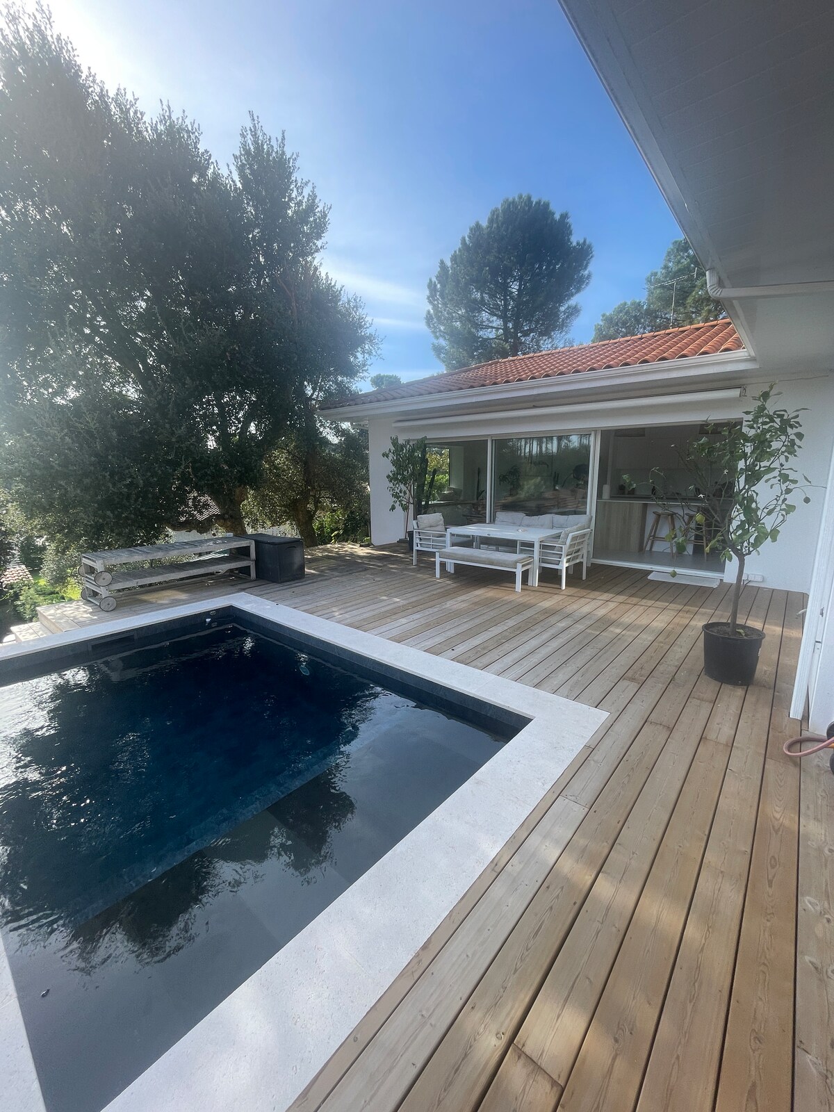 Alojamiento de lujo de una sola planta completamente renovado en 2021 en una urbanización muy tranquila, Ubicación geográfica ideal: 5 minutos del pueblo y de todos los servicios, 10 minutos del centro de Bayona y de las playas de las Landas, 30 minutos de España. ¡Su anfitrión es un conductor privado y puede llamar a sus servicios si lo desea!