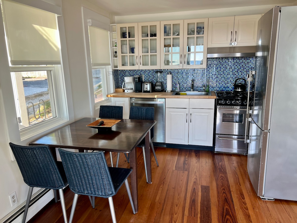 Cocina abierta + salón + comedor, con un techo inclinado de madera y dos correderas con vistas a la terraza, patio trasero + pantano. Cocina funcional con fregadero de granja, lavavajillas, cocina y despensa. Dos cómodas habitaciones con aire acondicionado de ventana, colchones nuevos y cortinas opacas. Baño con bañera/ducha + muchas toallas para la playa o el uso de la casa. ¡La ducha al aire libre es genial en los meses más cálidos! Disfruta de este tranquilo y escondido lugar de Wellfleet con muchos senderos para caminar y hermosas vistas del atardecer justo al final de la carretera.