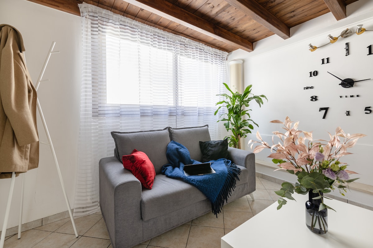 Charming House è situato in una tranquilla zona residenziale nel centro storico dell’hinterland nolano. L’appartamento è completamente indipendente con posto auto esterno. L'appartamento è così composto: •ingresso •soggiorno rifinito con travi in legno a vista •cucina •2 camere da letto matrimoniali di cui una soppalcata •1 bagno completo • 1 bagno di servizio