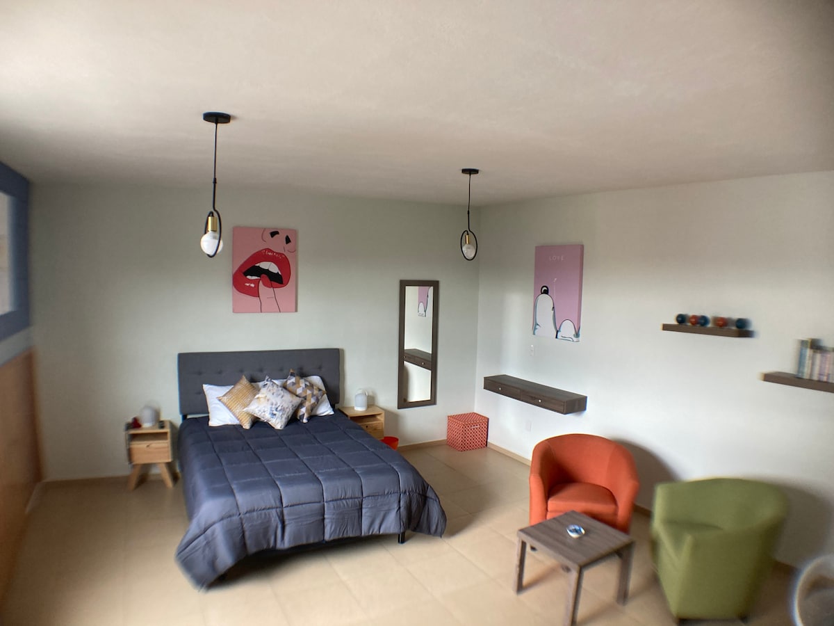 Lindísimo loft ubicado en una zona céntrica y muy bien conectada. Este lindo espacio es muy cómodo, muy bien iluminado en el día, de noche silencioso y con persianas blackout, cálido, con smart TV , WiFi de alta velocidad, el baño está equipado. En la cocina podrás preparar café, té o algún bocadillo. Se ofrece desayuno tipo continental para comenzar el día.