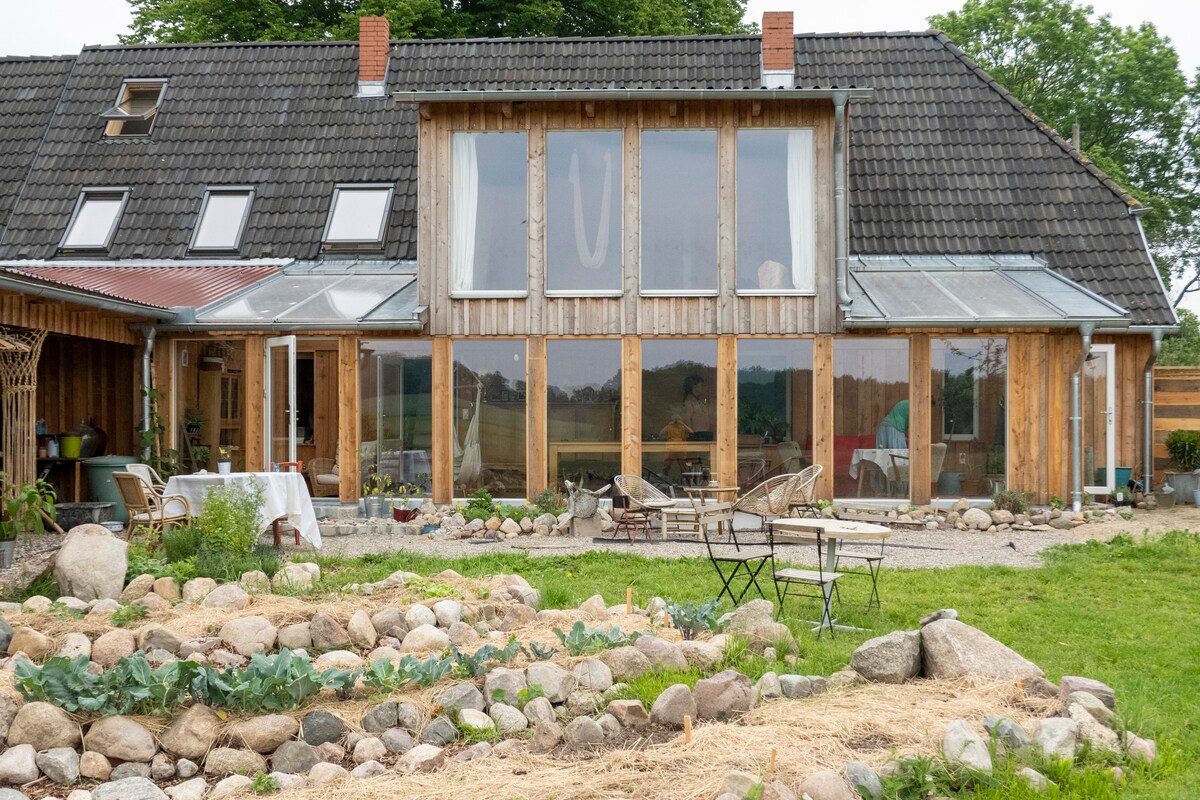 Llegarán a una pequeña granja orgánica con una tienda de alimentos saludables con hortalizas, pollos, gansos, vacas, gatos y perros. El alojamiento está completamente renovado ecológicamente y también se puede utilizar como sala de seminarios o para eventos. Hay un total de aproximadamente 90 m². Cocina y baño con ducha. Además, una gran habitación con cama doble en el podio y una pequeña habitación con literas. La habitación grande se calienta con una estufa de pellets. Nuestra granja está situada exactamente en el centro entre Rostock y Wismar cerca del mar