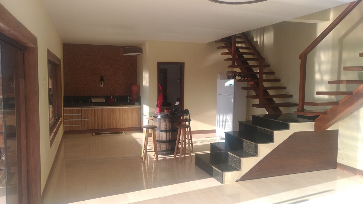 ¡Nuestro refugio es tranquilo, rodeado de naturaleza y con una excelente estructura! Hay 3 dormitorios (2 suites) y 5 baños, ideal para familias o grupos de amigos. La sala es amplia y confortable, la cocina es moderna y está bien ventilada, equipada con todo lo necesario. Pero lo más destacado de nuestro sitio es, sin duda, nuestra área exterior con jacuzzi climatizado, parrilla, mesa de juegos e iluminación moderna. ¡No pierdas la oportunidad de disfrutar de este lugar de mucha paz, pero también perfecto para descansar!