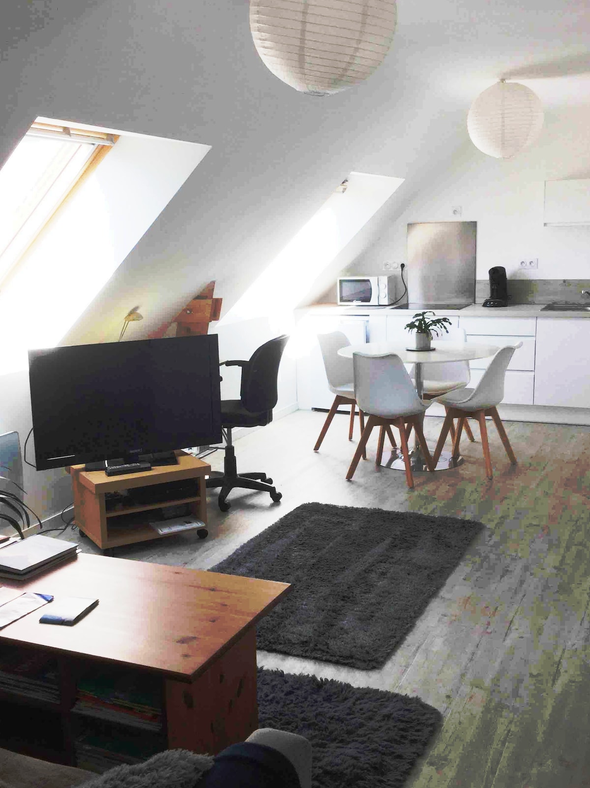El apartamento es independiente y está situado en la planta superior de nuestra casa, a 2 pasos de los alineamientos, en el corazón de las rutas de senderismo, a 5 minutos en bicicleta del centro de la ciudad y a 10 minutos de las playas. Consta de un dormitorio con escritorio y vestidor, una zona abierta de cocina equipada, mesa de comedor, sala de estar con TV y una pequeña terraza exterior. Hay una plaza de aparcamiento gratuita disponible frente a la casa. La conexión a Internet se realiza a través de fibra