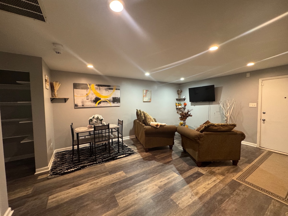 Entra en un apartamento de concepto abierto generosamente espacioso. El cómodo mobiliario de esta casa combina estilos auténticos con un diseño moderno. Comienza tus mañanas con un baño meticulosamente limpio. Disfruta de una noche de cine en la gran sala de estar o acuéstate en la cómoda cama tamaño king. Lee toda la noche junto a una cálida estufa. ¡Quédate en el patio trasero y disfruta de la serenidad de Sykesville! Disfruta de internet de alta velocidad y del amplio espacio para tus necesidades de trabajo en casa. Quédate un rato y haz del lugar tu hogar.