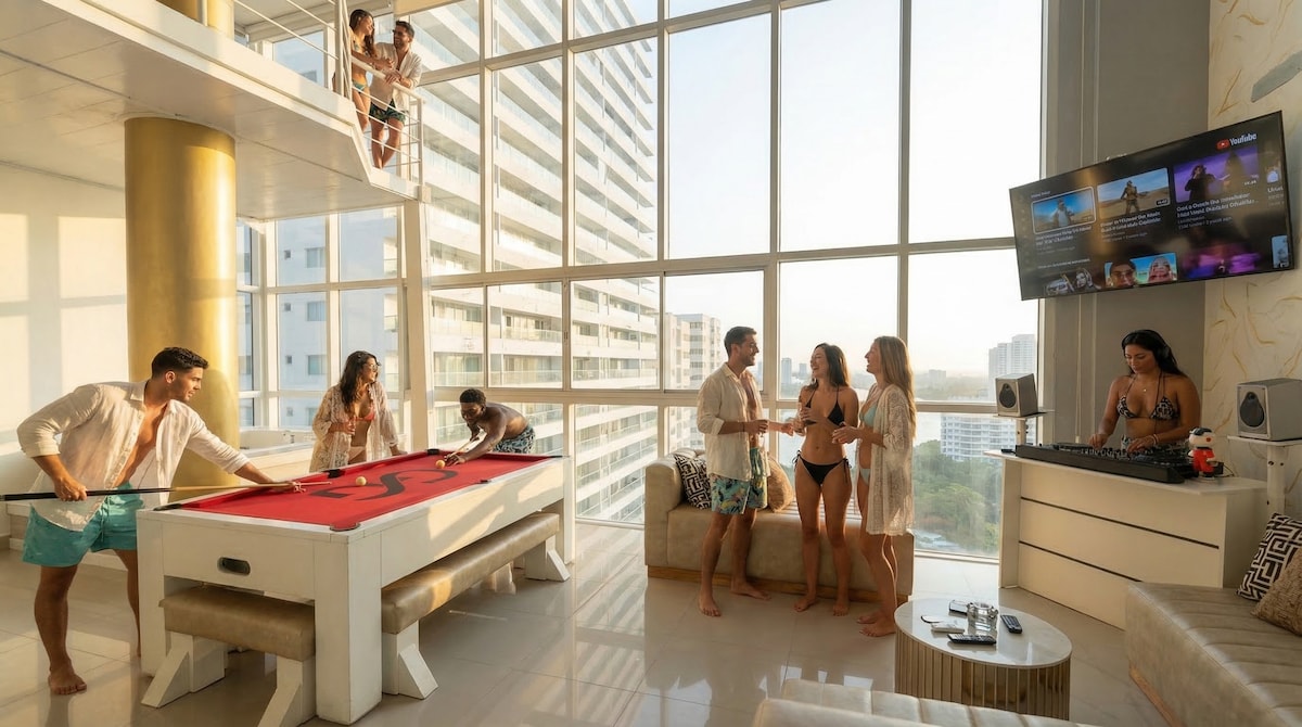 This exclusive duplex offers a one of a kind luxury experience in Cartagena. Just 5 minutes from the airport and close to the historic center, it has a jacuzzi in the room with panoramic view, pool table, Balcony pin pon, and video game machine. In addition, its projector will allow you to enjoy movies on a giant screen. Private balcony, outdoor shower. Every detail is designed to provide you an indulgent and luxurious stay, combining comfort and entertainment in one place.