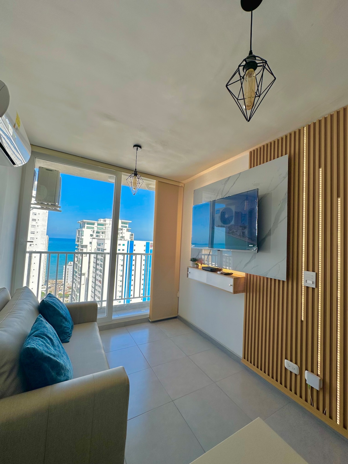 Impresionante piscina en piso 27 con vistas al mar y ciudad. Apto. moderno de 2 alcobas y 2 baños en edificio nuevo con amenidades. Luminoso con aire acondicionado en todos los espacios, 2 Smart TV y balcón privado. Wi-Fi rápido, ideal para trabajo remoto o relax. A 150 m de la playa y a solo 13 min del Centro Histórico. Perfecto para familias o 2 parejas, hasta 6 huéspedes. No visitas ni cambios tras check-in. Piscina y áreas comunes pueden entrar en mantenimiento sin previo aviso.