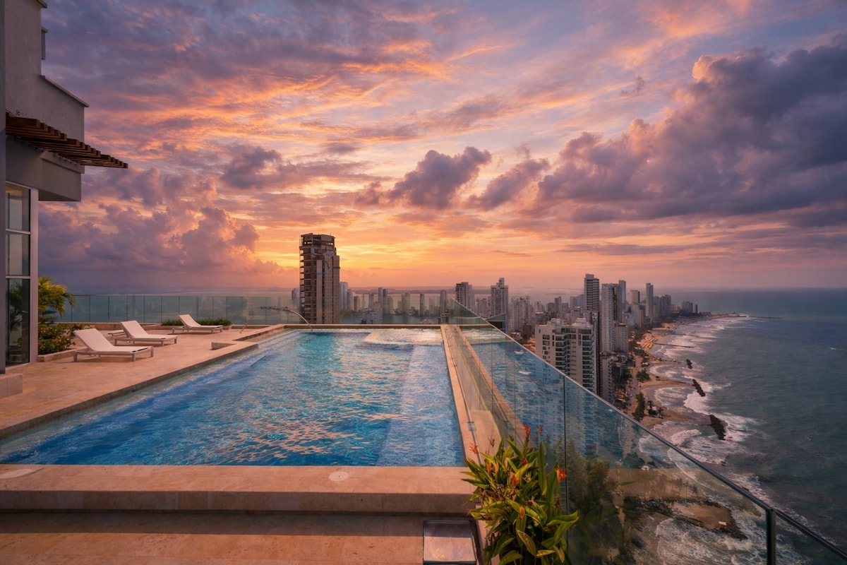 Nuestro elegante apartamento está ubicado en uno de los más completos y modernos edificios del exclusivo sector "Cielo Mar", a pocos metros de una de las mejores playas de la ciudad "Playa azul", a 10 minutos del Centro Histórico y a 5 minutos del aeropuerto. El apartamento tiene una vista Extraordinaria de la Bahía y el Océano que puedes disfrutar desde el Jacuzzi privado en el balcón o en las increíbles Piscinas infinitas en el Rooftop que cuenta Jacuzzis, Sauna, Terraza Bar & BBQ