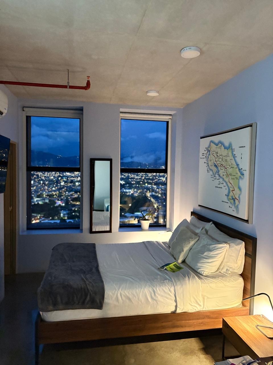 El espacio es muy cómodo ya que está equipado con utensilios de cocina, mesa de trabajo, wifi, tv, aire acondicionado, sillón individual, sillón para dos personas, estantes, closets, etc que lo hacen muy acogedor. Además cuenta con un balcón con puertas corredizas que permite disfrutar de hermosas vistas hacia San José y montañas, atardeceres increíbles y aire fresco. La mayor parte de las calificaciones destacan la limpieza del espacio, algo que particularmente nos preocupamos en ofrecer.