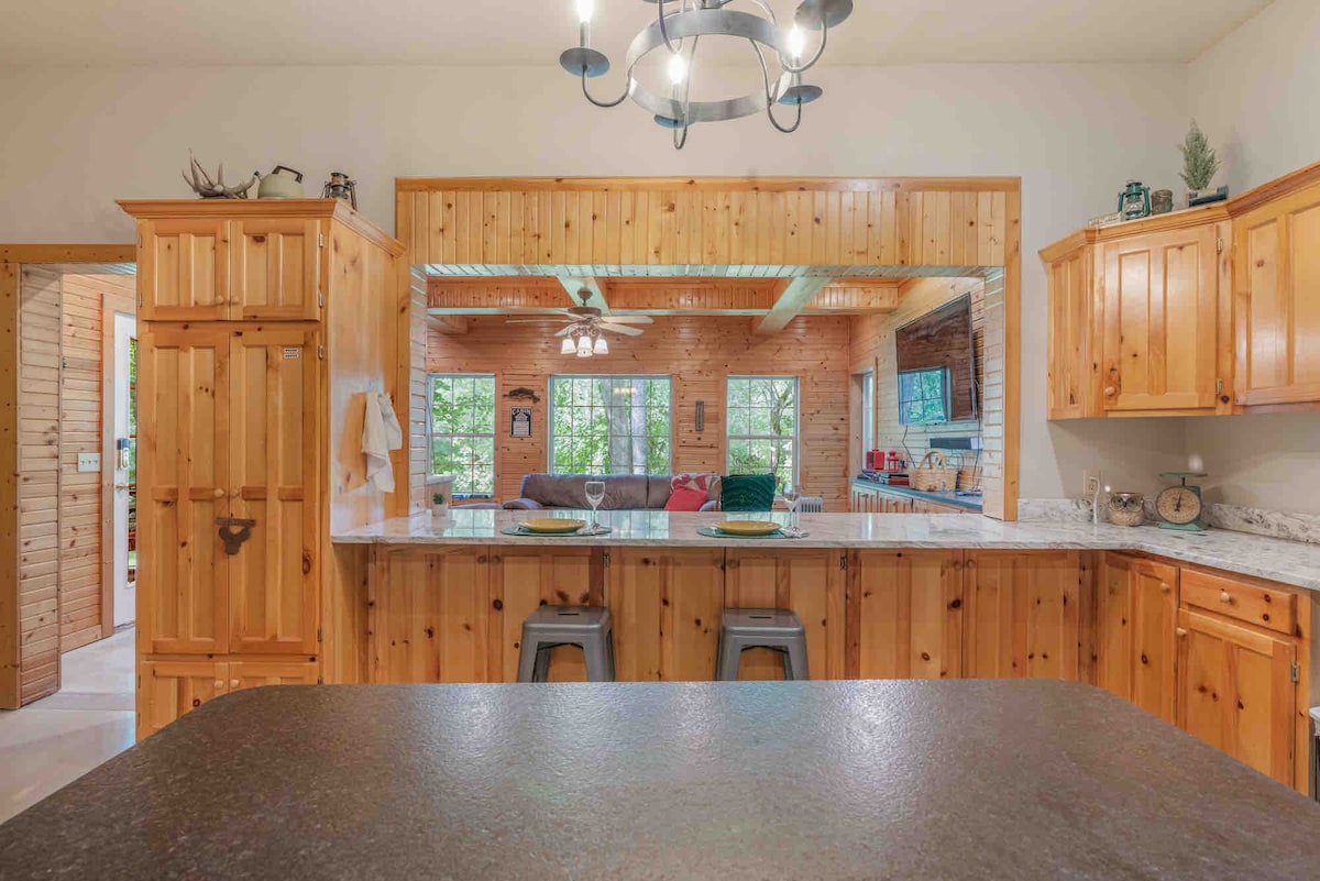 Retreat to this charming two story cabin overlooking the beautiful, peaceful Sunset Pond! Only a short distance from Joplin, Carl Junction, and Galena, KS, this cabin is surrounded by several ponds, the largest of which is right outside your front door. The cabin features free WIFI, 3 Smart TV's, a fully equipped kitchen, and a washer & dryer. Outside, enjoy catch and release fishing from the dock or just sit and take in the moment when a gorgeous sunset meets the peaceful water!