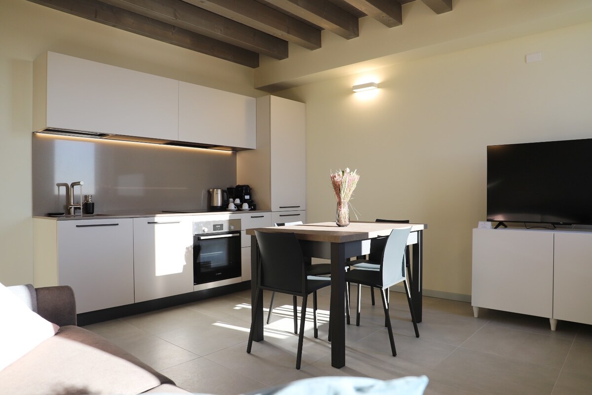 Lussuoso appartamento in centro storico a due passi dal Balcone di Giulietta. Sviluppato su due piani con ampia terrazza soleggiata, l' appartamento è reso luminoso da parti di pavimentazione in vetro calpestatile. Bagno open space con doccia a vista e vasca free standing. Una antica asse in rovere massiccio funge da tavolo nella modernissima cucina.
