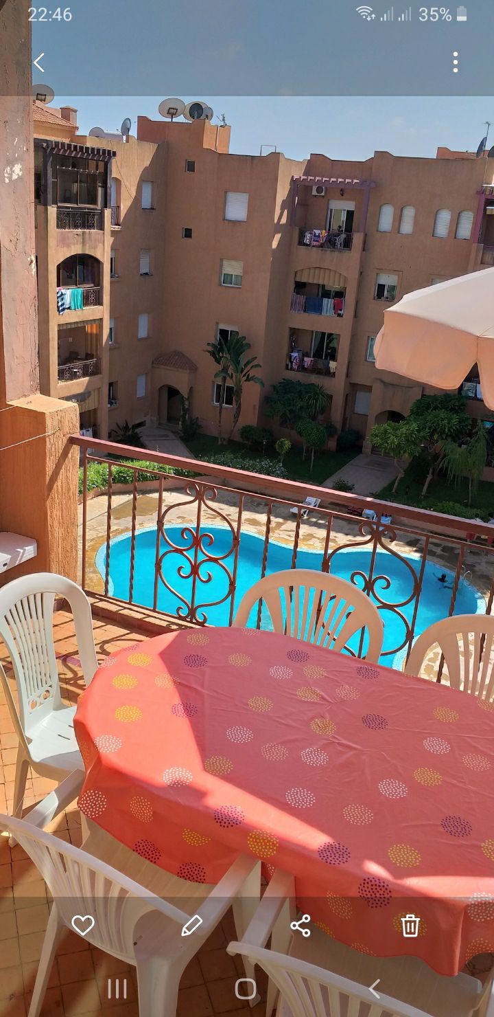 Bonjour, Je mets en location un appartement de 90m². L'appartement est situé dans la résidence Marbella Beach à Mansouria. L'appart est meublé,ensoleillé, propre avec 2 chambres en lits double+grand salon avec TV et salle à manger + cuisine équipée + 2 salles d'eau + deux balcons (vue sur mer et vue sur piscine). La résidence est sécurisée + Piscines + Air de jeu + Super marché. A 10 min en voiture des plages Mimoza, David et 25 min de Daomé, Bouznika Idéal pour une famille entre 5 et 7 pers.