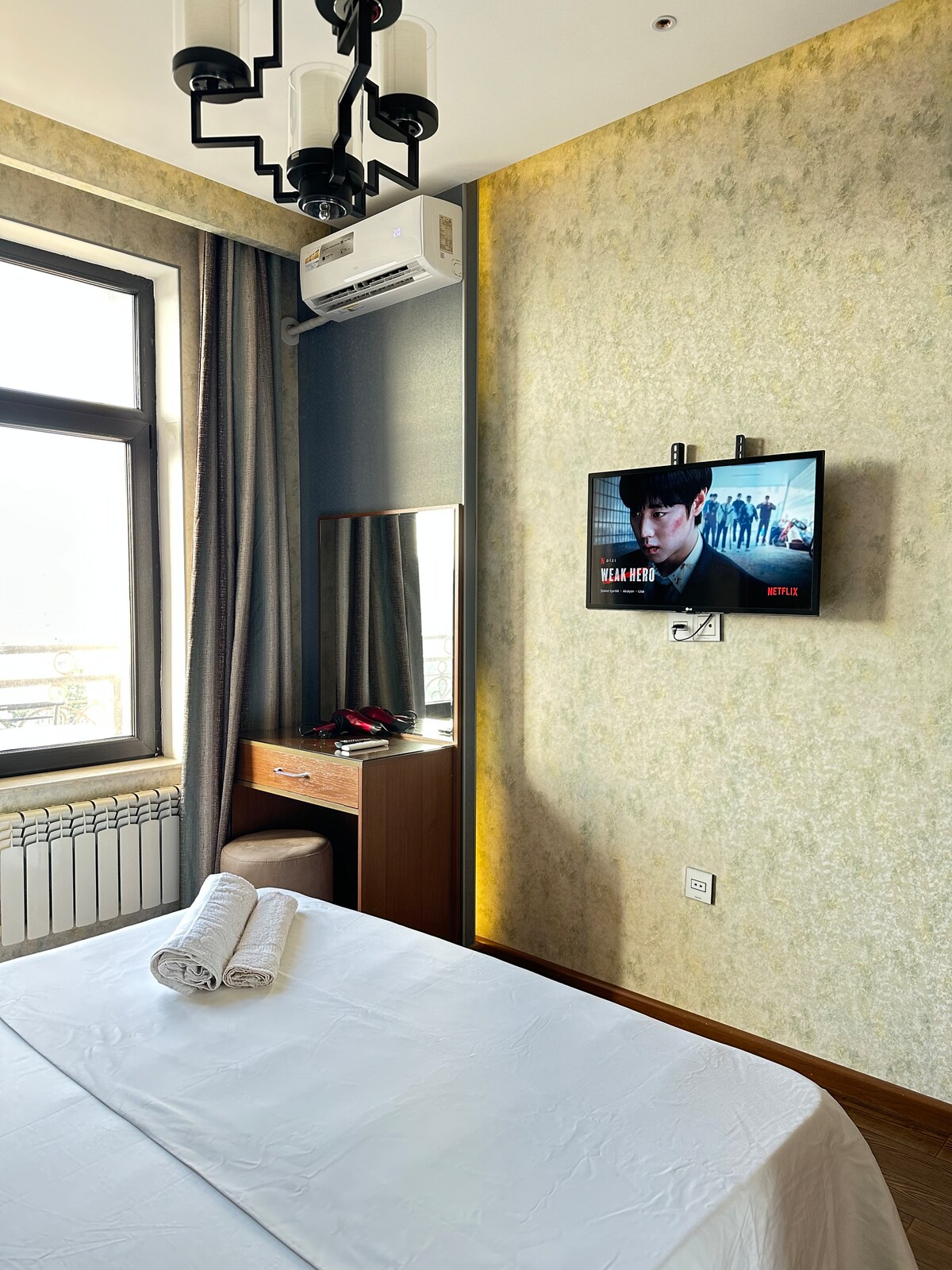 Despiértate con unas vistas impresionantes de la ciudad y el Caspio en este apartamento recientemente renovado en el corazón de White City, junto a la COP29. Disfruta de una cama tamaño king, un balcón privado con una silla tipo huevo y un salón luminoso con una televisión de 85", Xbox y una cocina totalmente equipada. Relájate con wifi rápido, aire acondicionado y lavadora-secadora en la suite. Los huéspedes también tienen acceso gratuito a un gimnasio, tenis de mesa y una mesa de billar. Cafés, tiendas y un parque tranquilo a solo unos pasos.