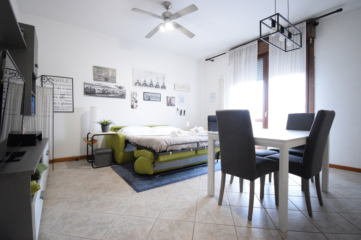 Acogedor y funcional apartamento de dos habitaciones recientemente renovado y amueblado, equipado con todo lo necesario para que pases una estancia de trabajo cómoda y agradable, durante eventos/ferias o vacaciones, es la solución ideal para estancias cortas de 2/3 personas. Situado en el centro, a pocos minutos a pie de tiendas, restaurantes, supermercados, bares y un cómodo aparcamiento público debajo de la casa. Entre Bolonia y Módena, está bien comunicado por transporte público, la estación de tren/autobús está a 700 metros.