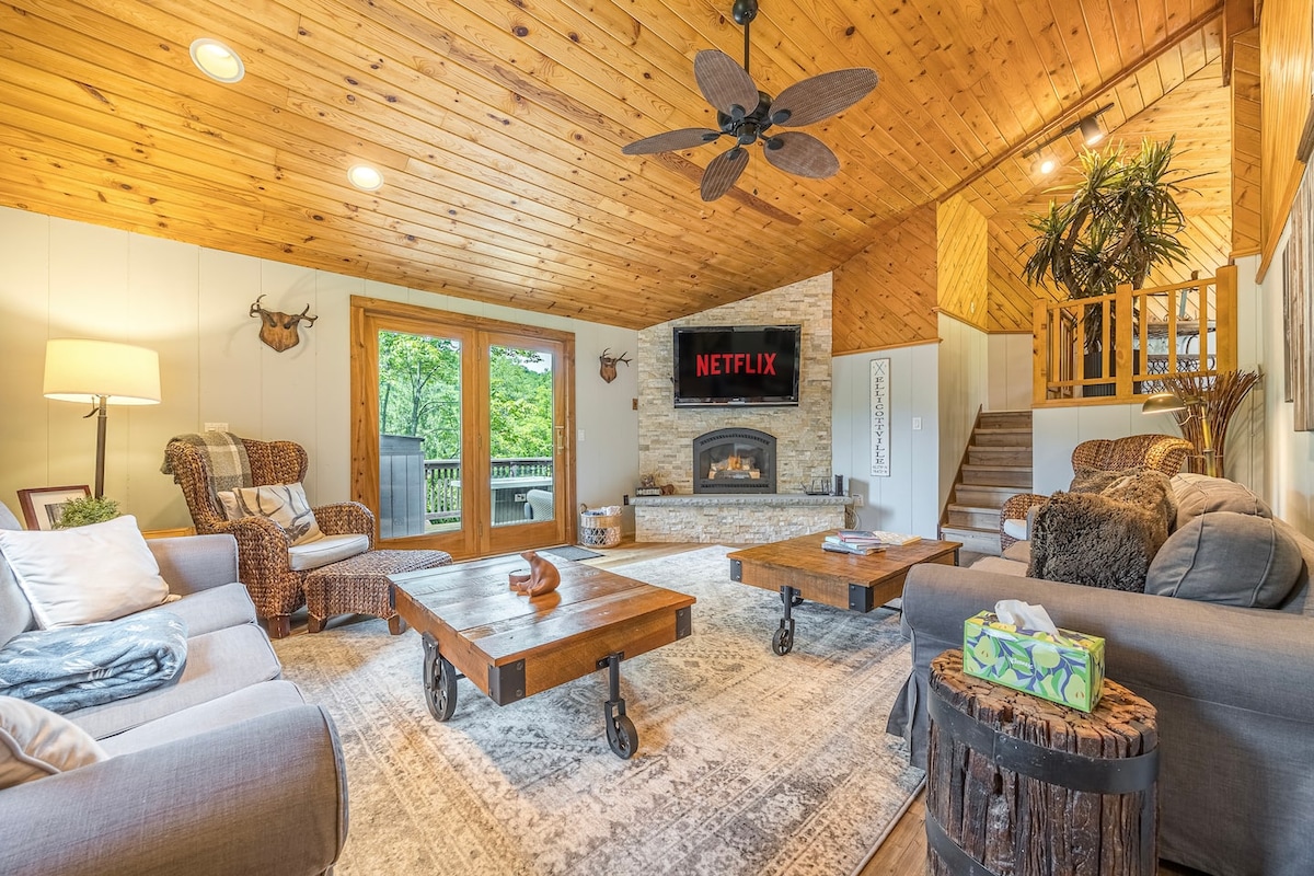 🏡Escápate a nuestro hermoso chalet con vigas de madera ubicado entre los árboles, a solo minutos del centro de Ellicottville, Holiday Valley y HoliMont. Con 5 dormitorios, 2,5 baños y dos amplias salas de estar, hay mucho espacio para la familia y los amigos. Relájate en la bañera de hidromasaje privada y en la sauna de barril, reúnete en la sala de juegos o disfruta de los acogedores espacios interiores y exteriores. Este refugio lleno de luz está diseñado para crear recuerdos durante todo el año.
