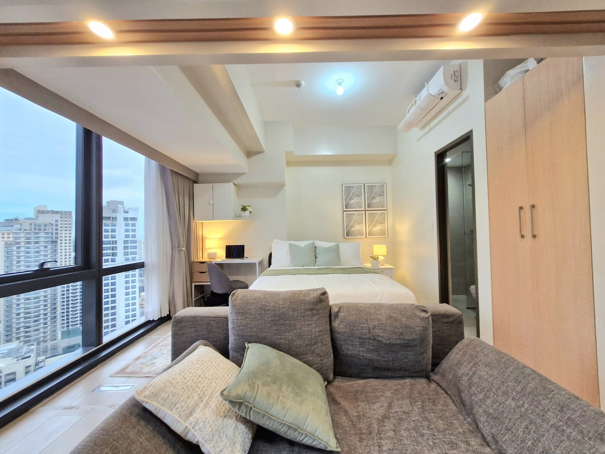 Enjoy a cozy 1BR-style executive studio on the 30th floor of Greenbelt Hamilton Tower 2. The space features a comfy queen bed, city views, fast WiFi, smart TV, cold AC, and a relaxing living area. Located in the heart of Makati, you’re steps from Greenbelt, Glorietta, cafés, restaurants, and groceries. Perfect for work trips, staycations, or long stays.