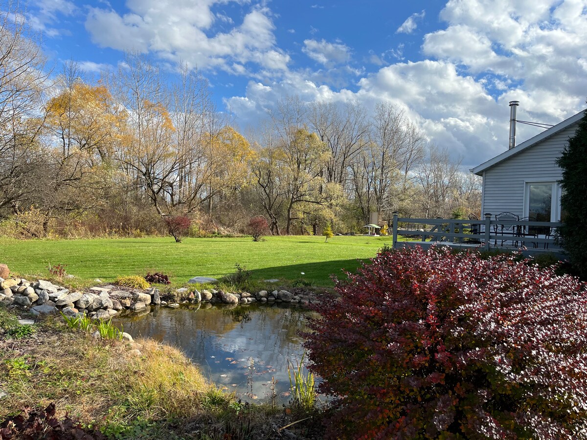 Esta casa está a unas 2 millas del pueblo, el lago, los restaurantes, los bares y la mayoría de los lugares para bodas. Disfruta de la belleza de Skaneateles y luego vuelve a tu propio oasis en casi un acre de paisaje cuidado con una maravillosa terraza con vistas a un estanque. Tómate el tiempo para ver la puesta del sol con una copa de vino o el amanecer con tu café de la mañana. Cafetería incluida con aperitivos. En invierno, disfruta de la estufa de leña (se proporciona leña, pero si necesitas más, Byrne Dairy tiene algo) y de los juegos.