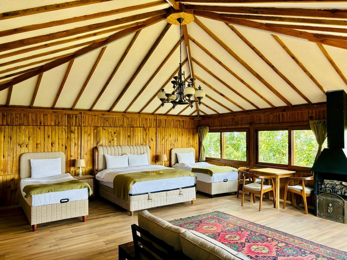 La habitación de madera, decorada con elementos de la combinación de lo antiguo y lo nuevo, te ofrece un ambiente hogareño cálido y acogedor con sus líneas tradicionales. Nuestras auténticas habitaciones, que proporcionan una cama doble y alojamiento, te están esperando para darte la bienvenida con el elegante diseño de baño, estufa de leña, nevera, aire acondicionado, Internet y TV con olor a leña.